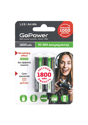 артикул: Аккумулятор бытовой GoPower HR6 AA BL2 NI-MH 1800mAh (2/20/240)