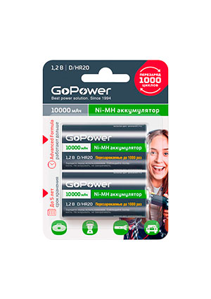 артикул: Аккумулятор бытовой GoPower HR20 D BL2 NI-MH 10000mAh (2/12/96)